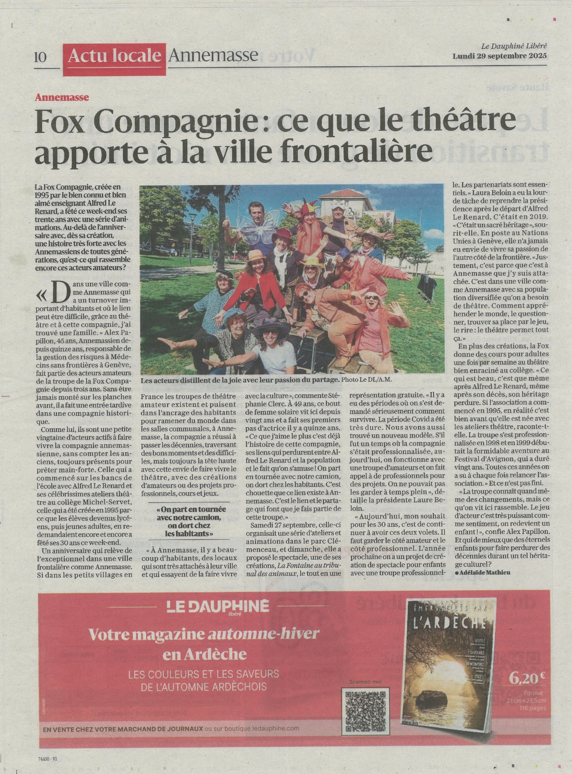 Fondée en 1995 par Alfred Le Renard, la Fox Compagnie célèbre cette année trois décennies de création théâtrale. Pour marquer cet anniversaire, nous avons organisé un week-end festif et convivial les 27 et 28 septembre 2025, à Annemasse, autour du Théâtre Alfred Le Renard (Collège Michel Servet) et du parc Clémenceau.